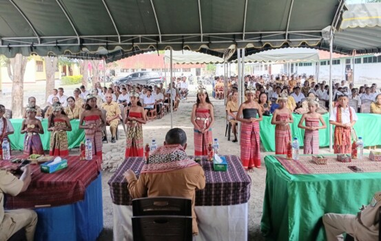 Kehadirannya disambut secara adat dengan pengalungan selendang dan tarian tradisional Bidu Lalok oleh siswa SDI Wemean.