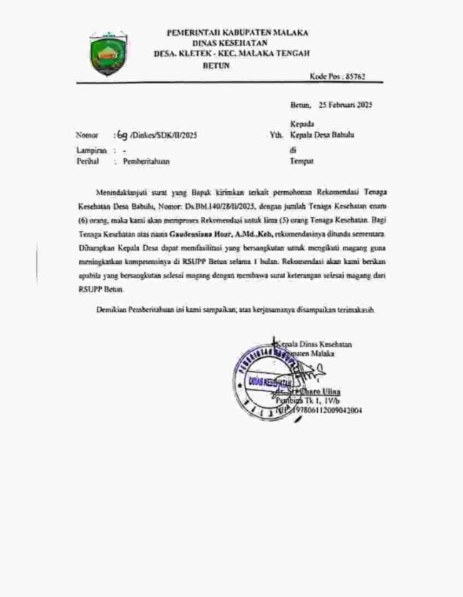 Melalui surat pemberitahuan yang dikeluarkan oleh Dinas Kesehatan Malaka, enam orang Nakes di Puskesmas Babulu diharuskan mengikuti magang selama satu bulan di RSPP Betun sebelum rekomendasi mereka dapat diproses.